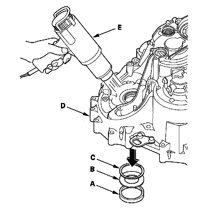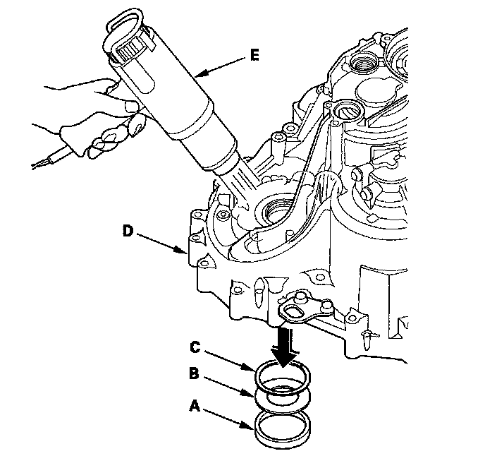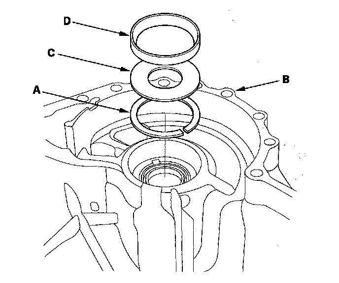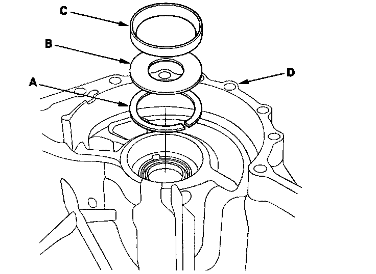 3. Install the spacer (C), and the bearing outer race (D) in the transmission housing.