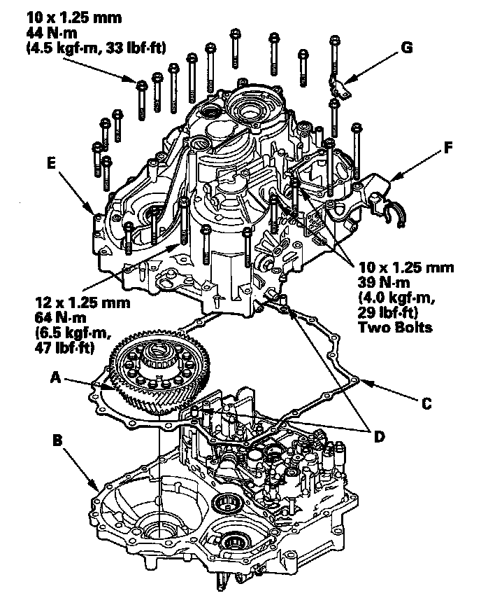 6. Install the transmission housing (E), and install the mounting bolts (23 bolts) with the transmission hanger (F) and the ground terminal bracket (G), then tighten the bolts.