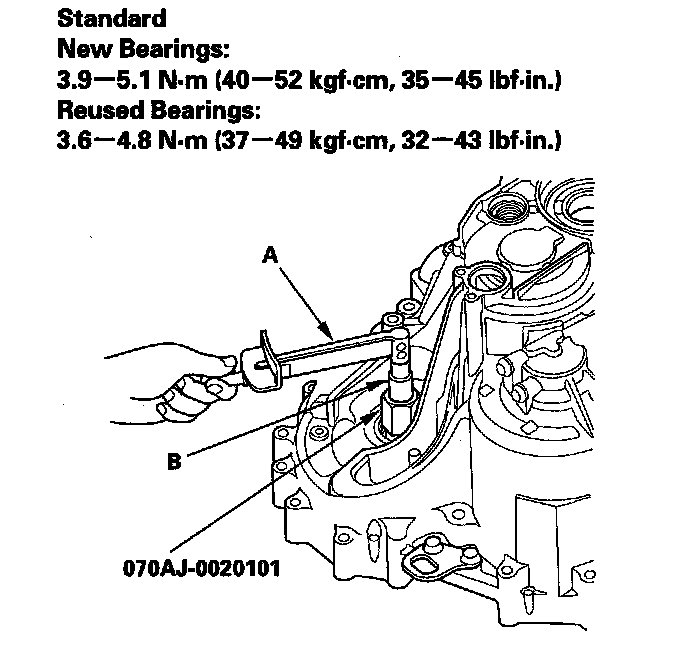 8. Measure the starting torque of the differential assembly using the preload inspection tool, a torque wrench (A), and a socket (B), Measure the starting torque at normal room temperature in both directions.