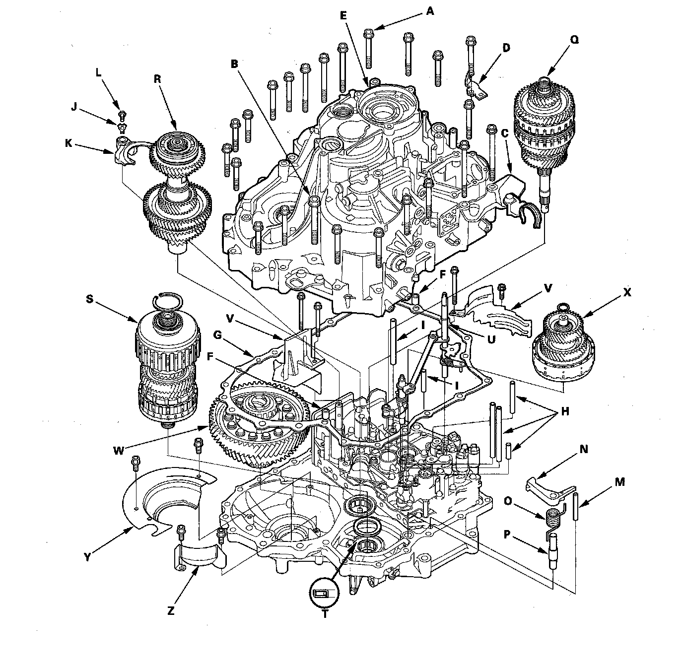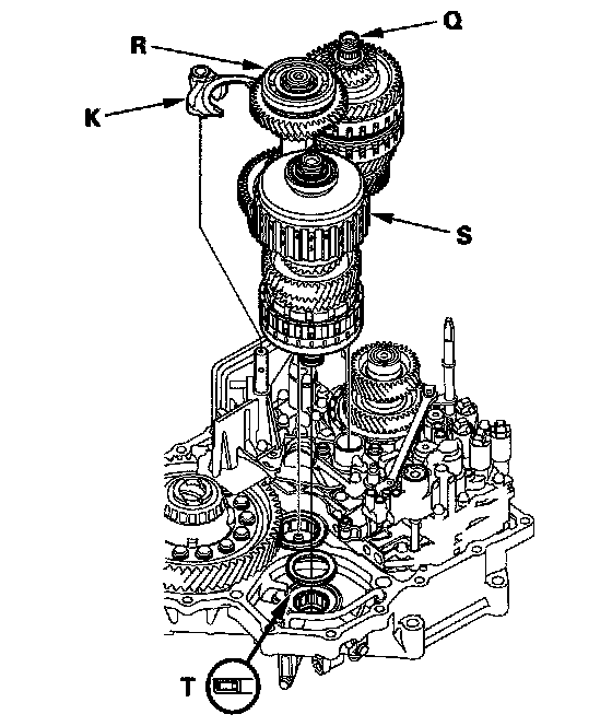 31. Remove the mainshaft (Q), the countershaft (R), the shift fork, and the secondary shaft (S) together, and remove the needle bearing (T) from the torque converter housing.