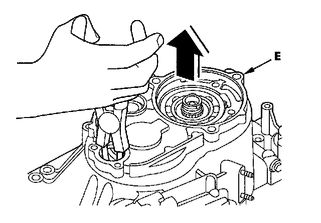 23. While expanding the snap ring of the countershaft bearing using the snap ring pliers, lift the transmission housing (E).