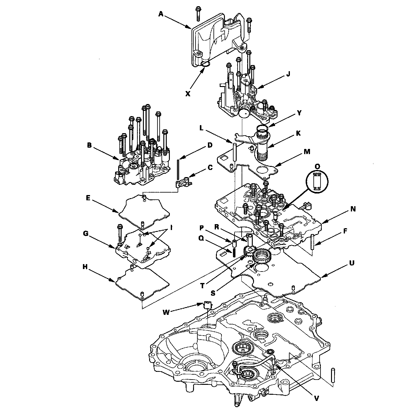 41. Remove the regulator valve body (J) (eight bolts), the stator shaft (K), the stator shaft stop (L), the dowel pins (two), and the separator plate (M).