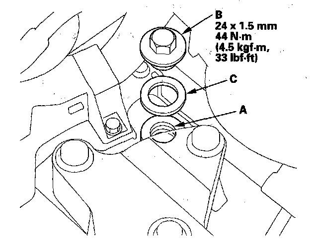 10. Install the ATF filler bolt (B) and a new sealing washer (C).