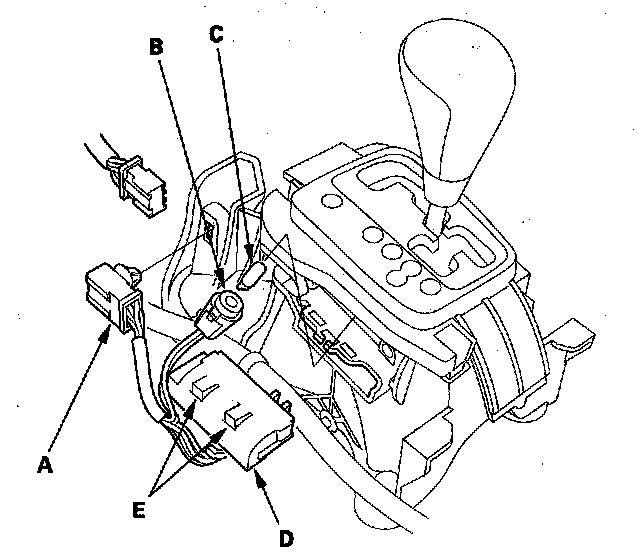 4. Remove the transmission gear selection switch/park pin switch (D) by releasing the lock tabs (E).