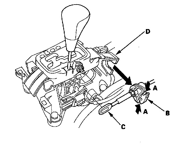 5. Press the holder lock release (A), and pull out the socket holder (B) to remove the shift cable (C) from the shift lever bracket base (D).
