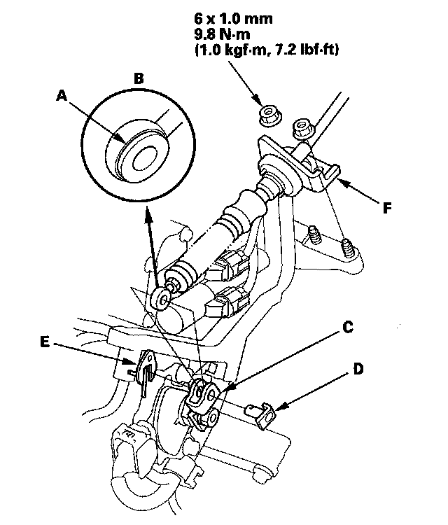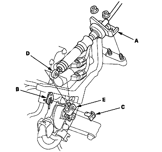 20. Apply molybdenum grease to the hole in the bushing (A) in the shift cable end (B). Attach the shift cable end to the control lever (C), then insert the control pin (D) into the control lever hole through the shift cable end, and secure the control pin with the spring clip/washer (E).