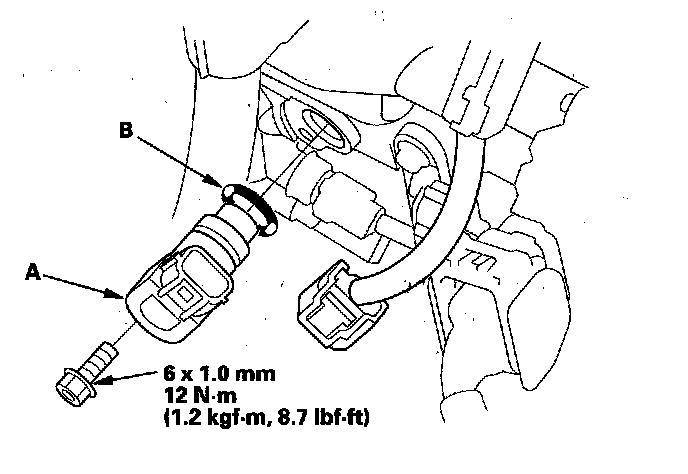 2. Install a new O-ring (B) on a new input shaft (mainshaft) speed sensor, then install the input shaft (mainshaft) speed sensor in the transmission housing.