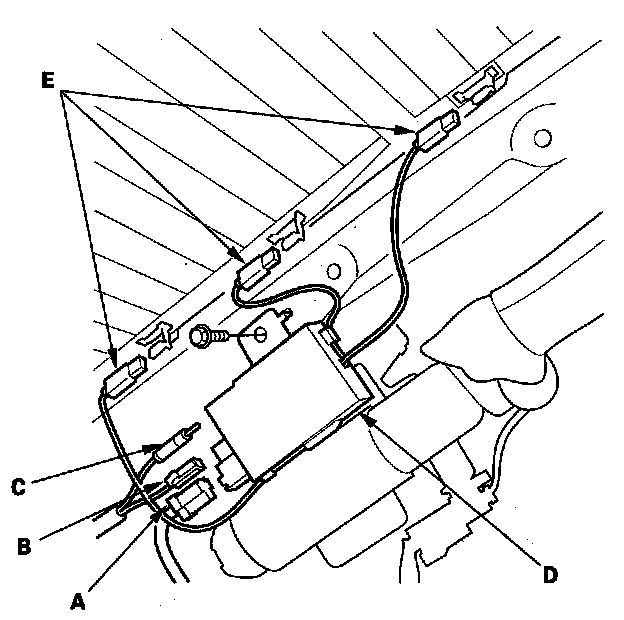 2. Disconnect the 1P connector (A), 1P connector (B), and AM/FM antenna lead (C) from the AM/FM antenna amplifier-rear window defogger coil (D) and the three window connectors (E).