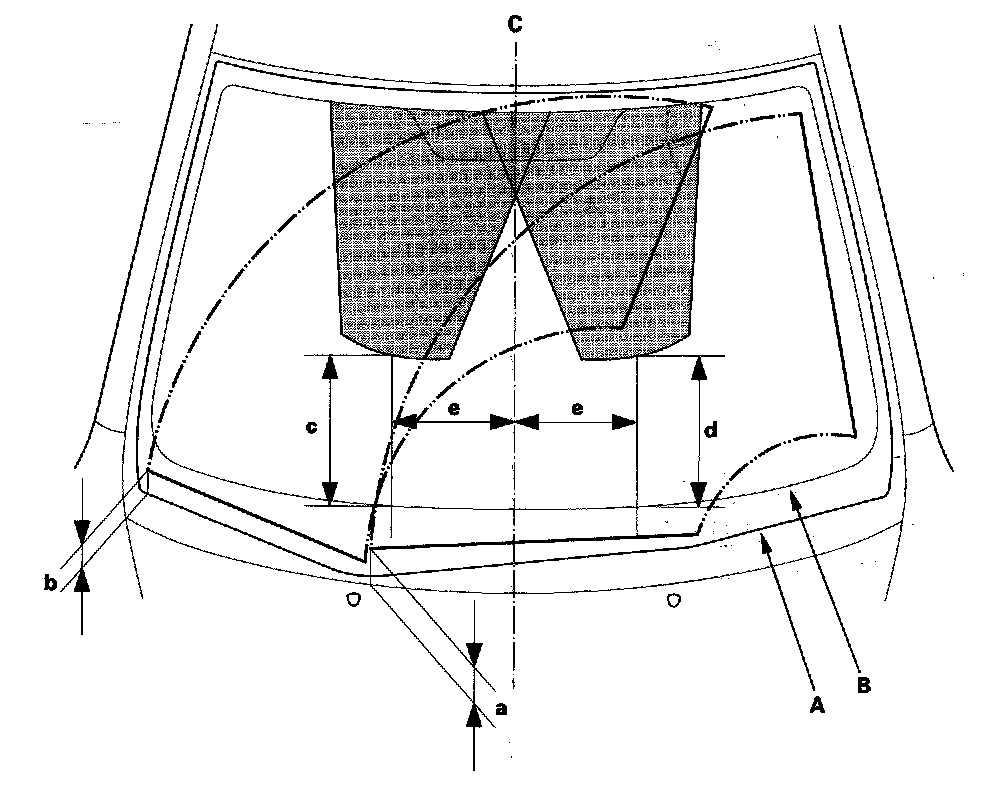 c: Position at about 11.6 in. (295 mm) from the top of black ceramic (B) at lower windshield