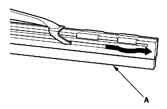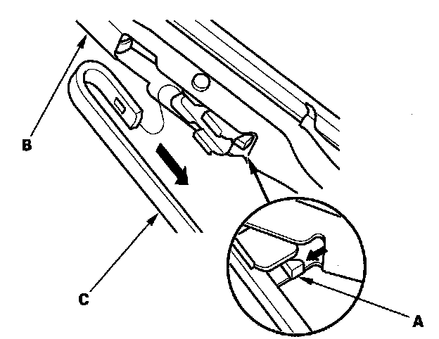 2. Press and hold the tab (A) and slide the wiper blade (B) toward the tab until it releases from the wiper arm (C).