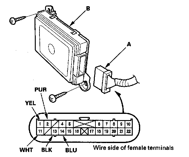3. Disconnect the 22P connector (A) from the HandsFreeLink control unit (B).