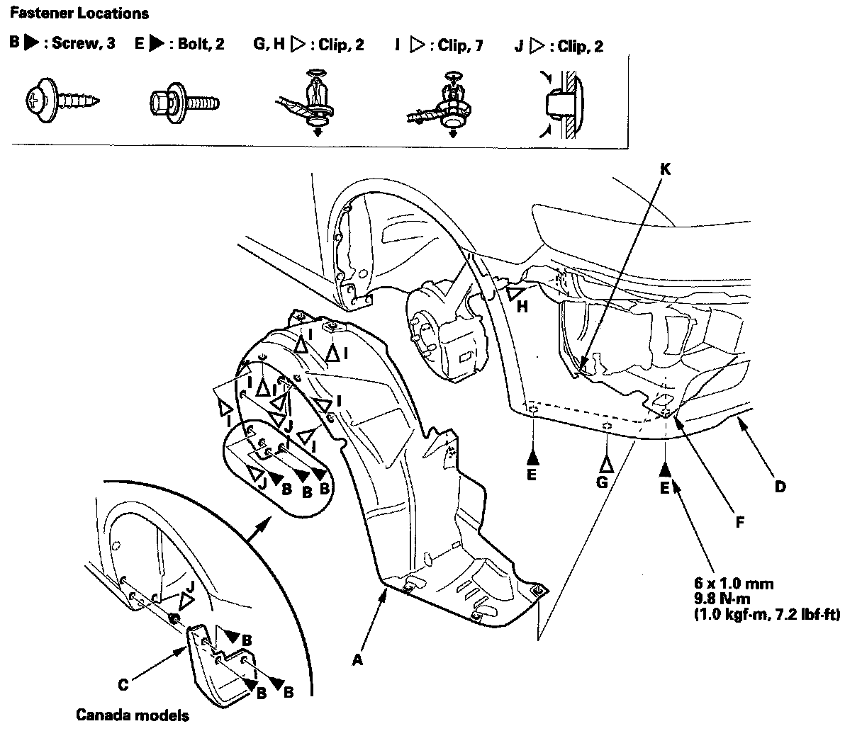 3. From the wheel arch, remove the clips (H, I, J) securing the front inner fender (and splash shield) on the body.