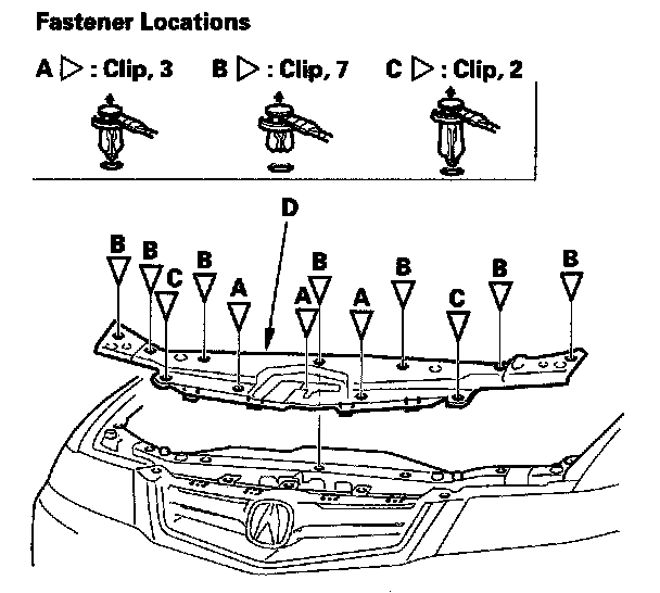 1. Remove the clips (A, B, C), then remove the front grille cover (D).
