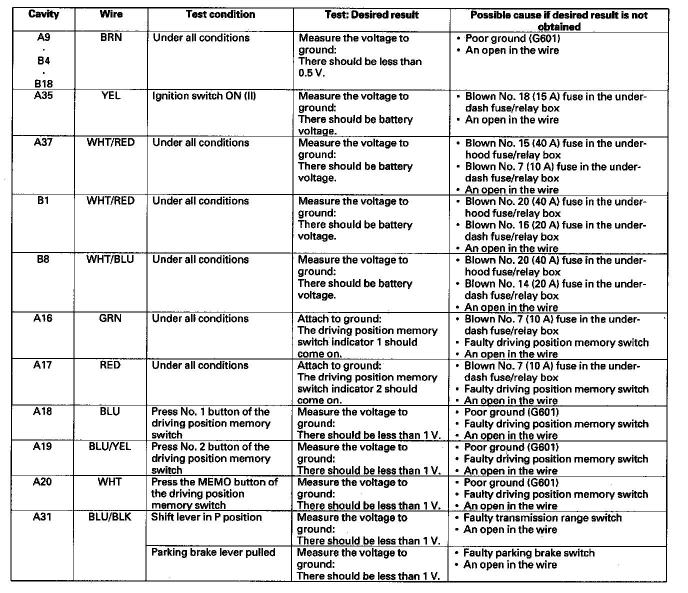5. Reconnect the connectors to the power seat control unit, and make these input tests at the connectors.