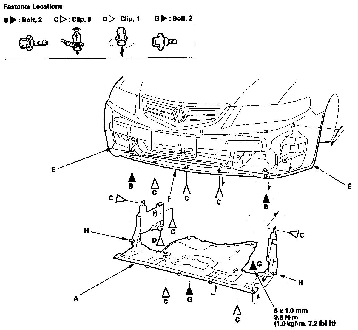 2. From under the front bumper (F), remove the clips (C), and bolts (G).