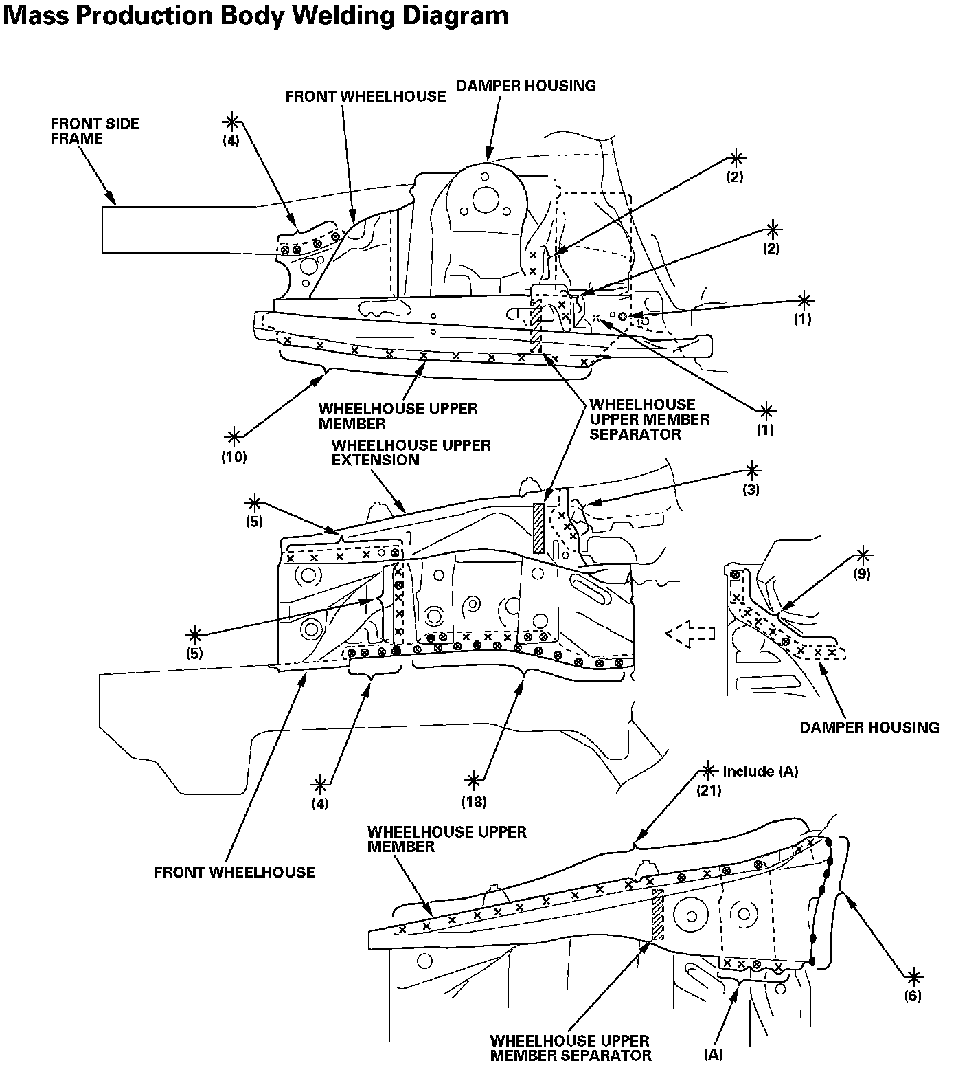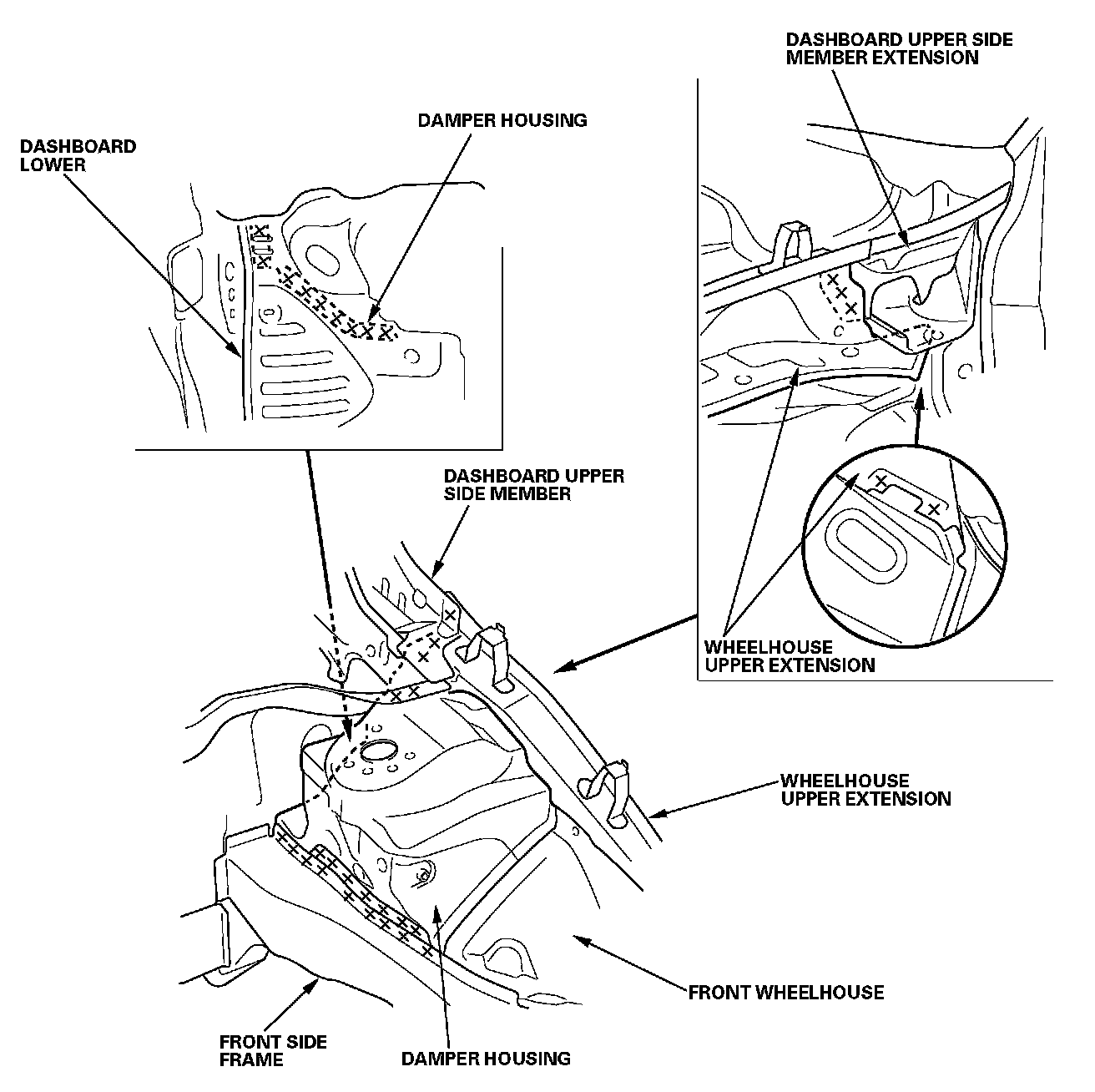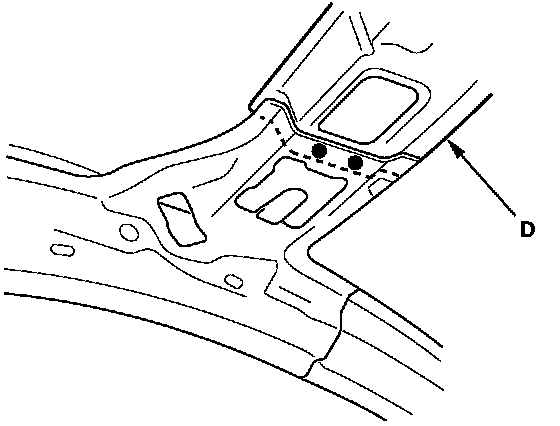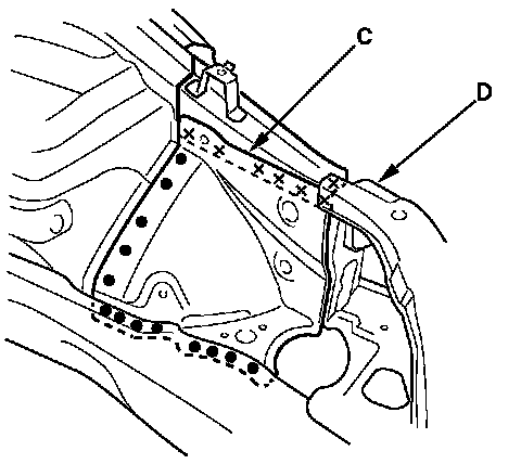 - Weld the damper housing (C), front wheelhouse and front side frame (D).
