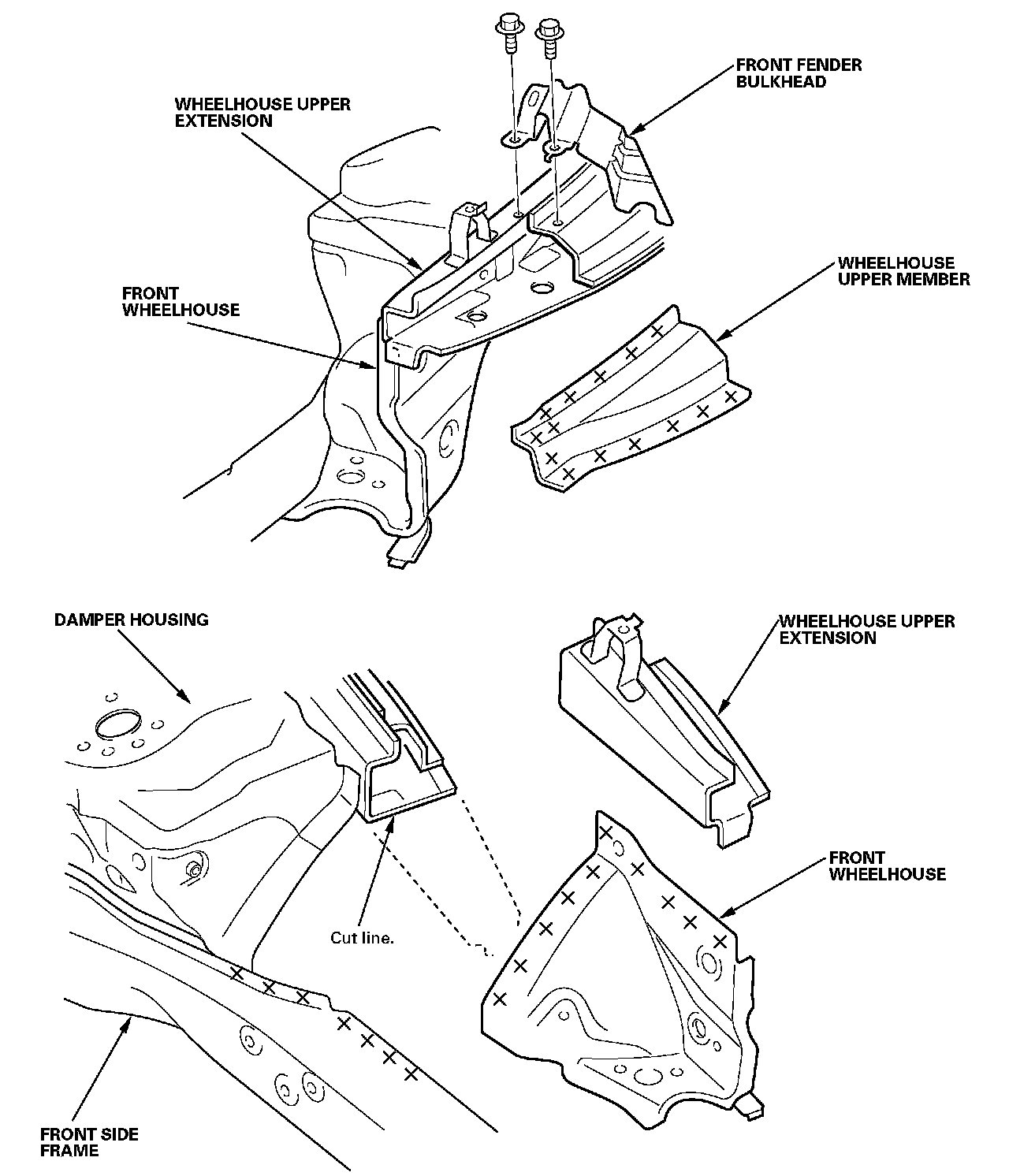 Replace the damper housing and wheelhouse upper extension as an assembly.