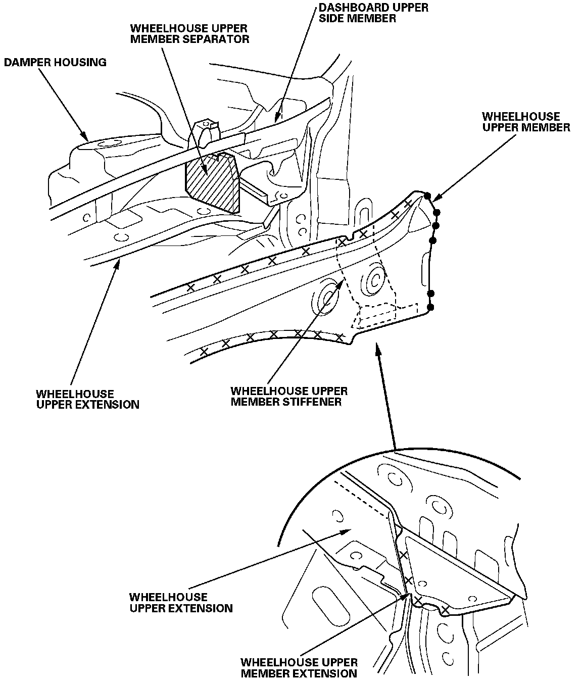 - Remove the wheelhouse upper member, and wheelhouse upper member separator.