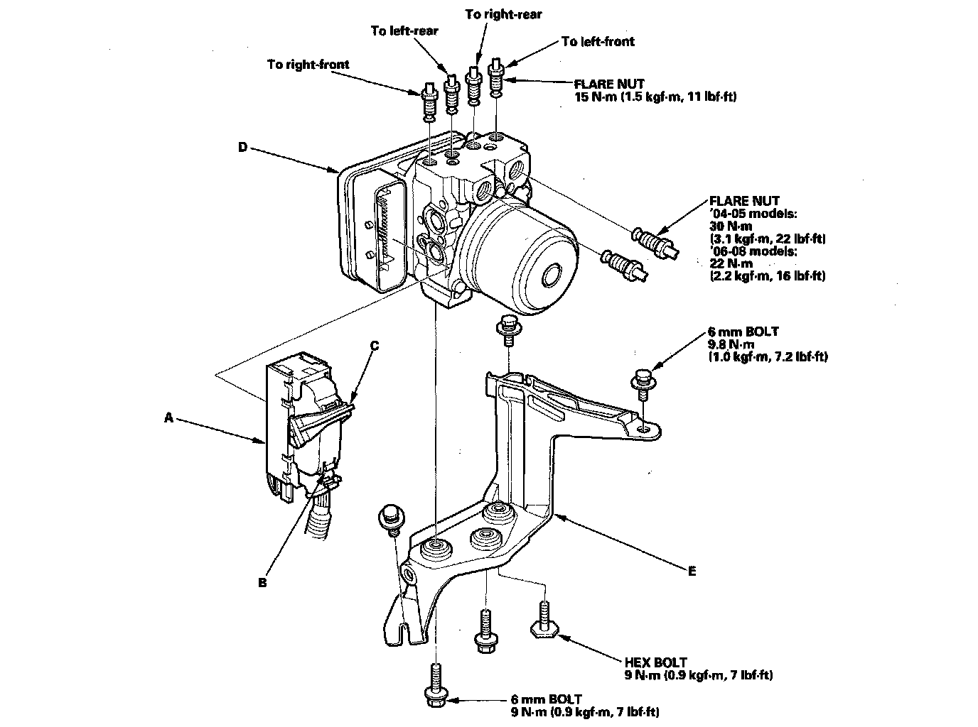3. Disconnect the six brake lines from the VSA modulator-control unit (D).