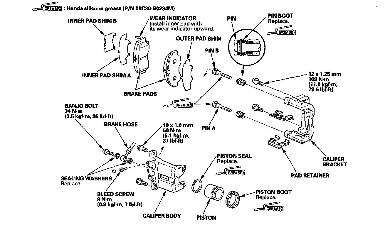 ^ After installing the caliper, check the brake hose and line for leaks, interference, and twisting.