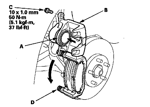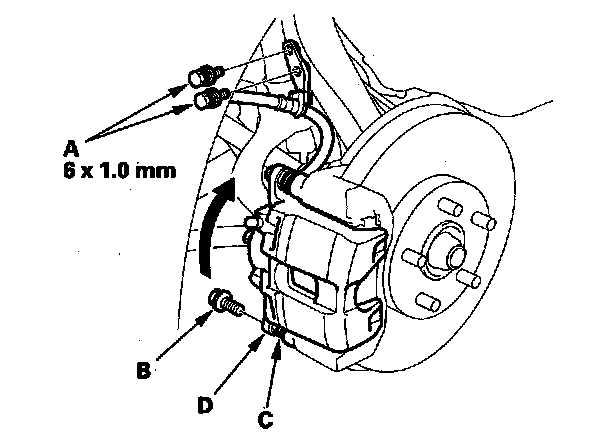 5. Remove the flange bolt (B) while holding the caliper pin (C) with a wrench being careful not to damage the pin boot, and pivot the caliper (D) up out of the way. Check the hose and pin boots for damage and deterioration.