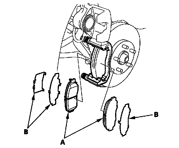 9. Clean the caliper bracket (B) thoroughly; remove any rust, and check for grooves and cracks.