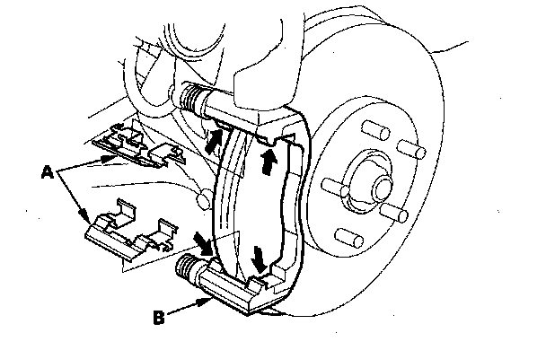 8. Remove the pad retainers (A), and check the caliper pin for free movement.