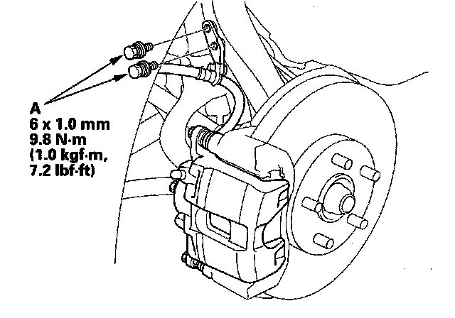 17. Install the brake hose mounting bolts (A), and tighten them to the specified torque.