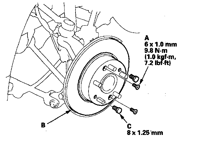 ^ If the brake disc is stuck to the hub bearing unit, thread two 8 x 1.25 mm bolts (C) into the brake disc to push it away from the hub bearing unit. Turn each bolt 90 degrees to prevent the brake disc from binding.