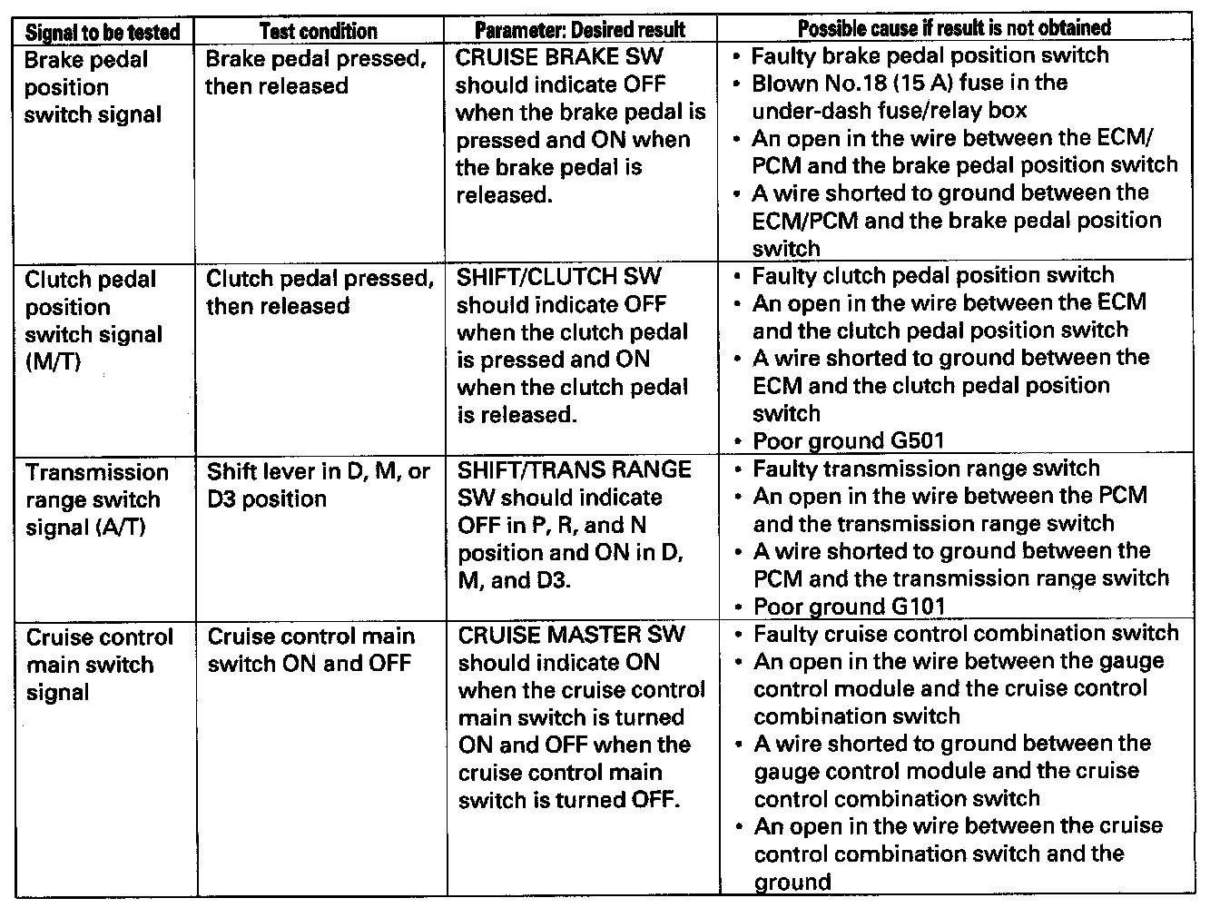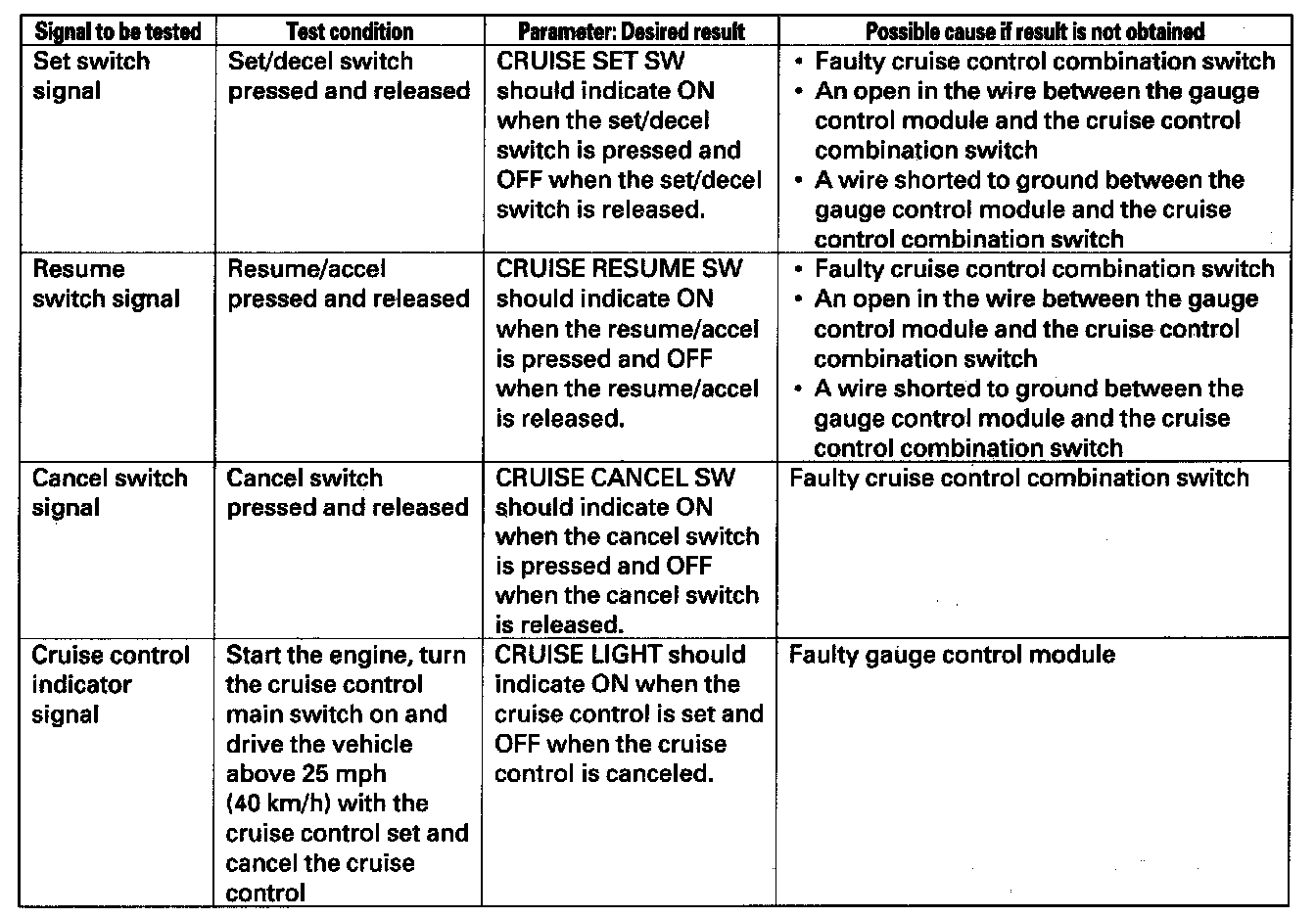 NOTE: Intermittent failures are often caused by loose circuit connections. While monitoring cruise control inputs, flex their circuits, and note if any of the test results change.