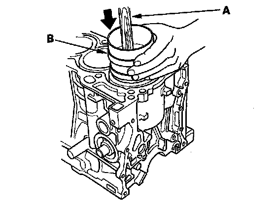 4. Position the piston/connecting rod assembly in the cylinder, and tap it in using the wooden handle of a hammer (A). Maintain downward force on the ring compressor (B) to prevent the rings from expanding before entering the cylinder bore.