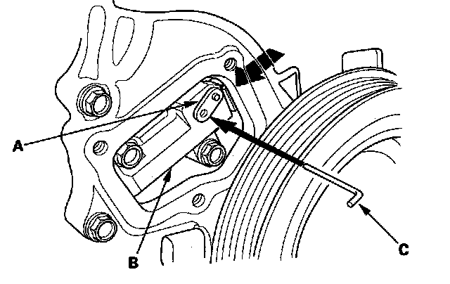 3. Align the holes on the lock (A) and the auto-tensioner (B), then insert a 1.2 mm (0.05 in.) diameter pin or lock pin (P/N 14511-PNA-003) (C) into the holes. Turn the crankshaft clockwise to secure the pin.