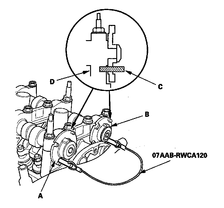 3. To hold the intake camshaft, insert one of the pins (C) from the camshaft lock pin set into the maintenance hole in the camshaft position (CMP) pulse plate A and and through the hole in the No. 5 rocker shaft holder (D).