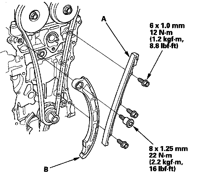 7. Install the cam chain guide A and the tensioner arm (B).