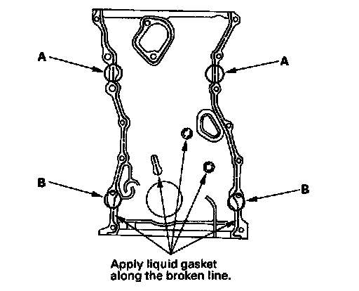 17. Apply liquid gasket to the engine block upper surface contact areas (A) on the chain case and lower block upper surface contact areas (B) on the chain case.
