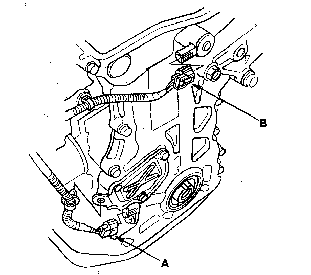 24. Connect the CKP sensor connector (A) and VTC oil control solenoid valve connector (B).