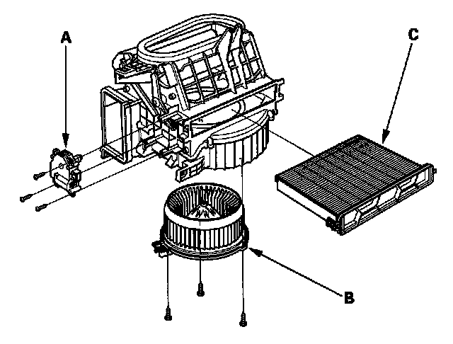 - The recirculation control motor (A), the blower motor (B), and the dust and pollen filter (C) can be replaced without removing the blower unit.