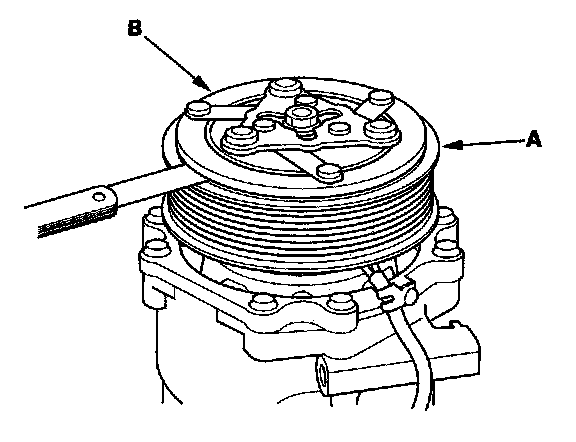 3. Measure the clearance between the rotor pulley (A) and the armature plate (B) all the way around. If the clearance is not within specified limits, remove the armature plate and add or remove shims as needed to increase or decrease clearance.