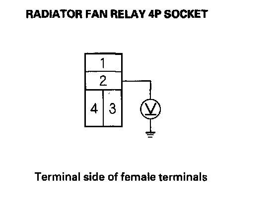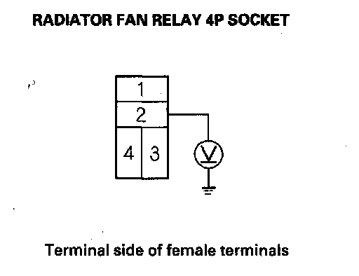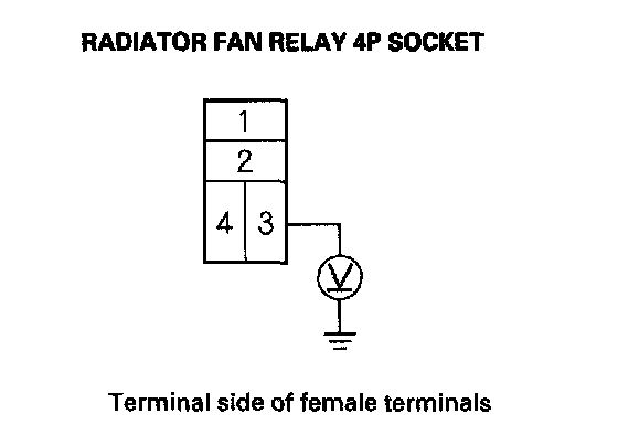 4. Measure the voltage between radiator fan relay 4P socket terminal No. 2 and body ground.
