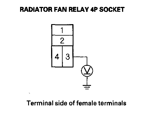 5. Disconnect the jumper, and turn the ignition switch ON (II). Check for voltage between radiator fan relay 4P socket terminal No. 3 and body ground.