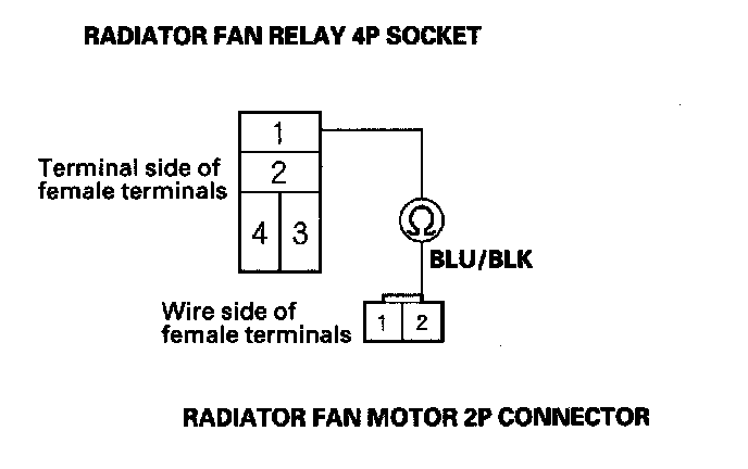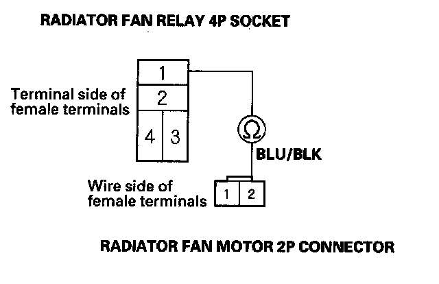 7. Check for continuity between radiator fan relay 4P socket terminal No. 1 and radiator fan motor 2P connector terminal No. 2.