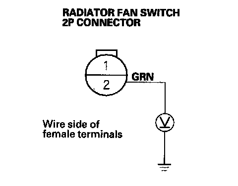 NO - Repair open in the wire between radiator fan switch 2P connector terminal No. 2 and the underhood fuse/relay box.