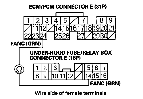 16. Check for continuity between ECM/PCM connector terminal E12 and under-hood fuse/relay box terminal E14.