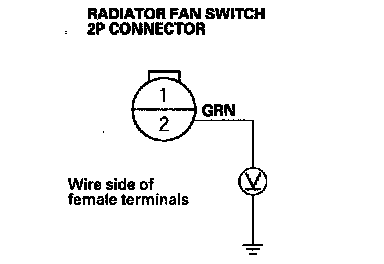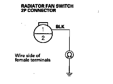 4. Turn the ignition switch OFF, and check for continuity between radiator fan switch 2P connector terminal No. 1 and body ground.