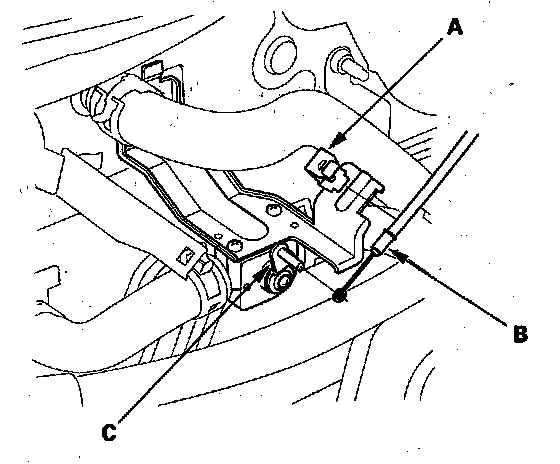 Heater Valve Cable Adjustment1. From under the hood, open the cable clamp (A), then disconnect the heater valve cable (B) from the heater valve arm (C).