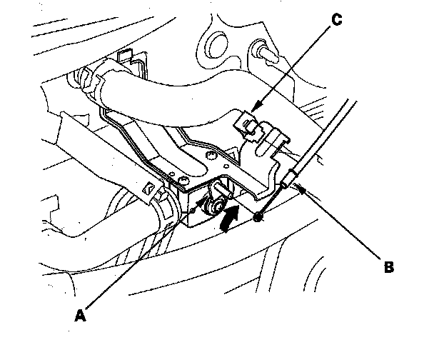 5. From under the hood, turn the heater valve arm (A) to the fully closed position as shown, and hold it. Attach the heater valve cable (B) to the heater valve arm, and gently pull on the heater valve cable housing to take up any slack, then install the heater valve cable housing into the cable clamp (C).