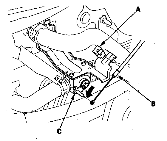 4. From under the hood, open the cable clamp (A), then disconnect the heater valve cable (B) from the heater valve arm (C). Turn the heater valve arm to the fully opened position as shown.