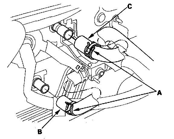 6. Slide the hose clamps (A) back. Remove the bolt and water valve bracket, then disconnect the inlet heater hose (B) and the outlet heater hose (C) from the heater unit. Engine coolant will run out when the hoses are disconnected; drain it into a clean drip pan. Be sure not to let coolant spill on the electrical parts or the painted surfaces. If any coolant spills, rinse it off immediately.