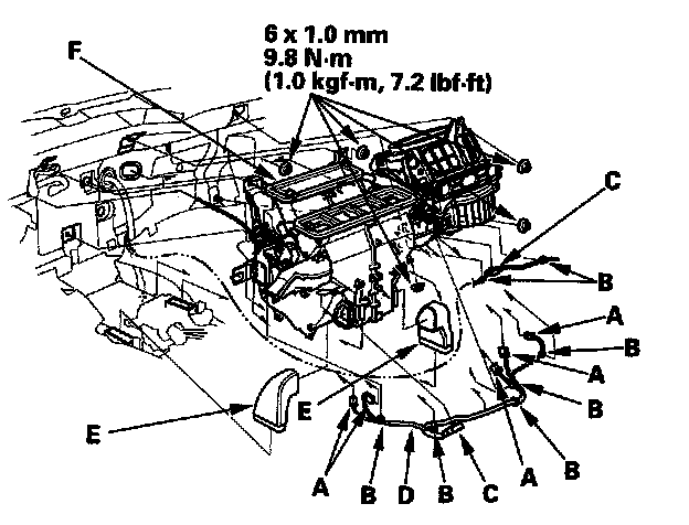 10. Disconnect the connectors (A) from the driver's air mix control motor, the evaporator temperature sensor, the power transistor, the mode control motor, passenger's air mix control motor, and the recirculation control motor, then remove the wire harness clips (B), the connector clips (C) and the wire harness (D). Remove the heater ducts (E), then remove the mounting nuts and the blower-heater unit (F).
