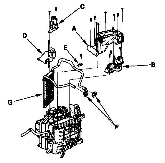 11. Remove the self-tapping screws and the joint duct A, then remove the self-tapping screws and the joint duct B. Remove the self-tapping screws, then remove the passenger's heater outlet (C), and the heater core cover (D). Remove the self-tapping screws, the heater pipe bracket (E), the grommets (F) and carefully pull out the heater core (G) so you don't bend the inlet and outlet pipes.